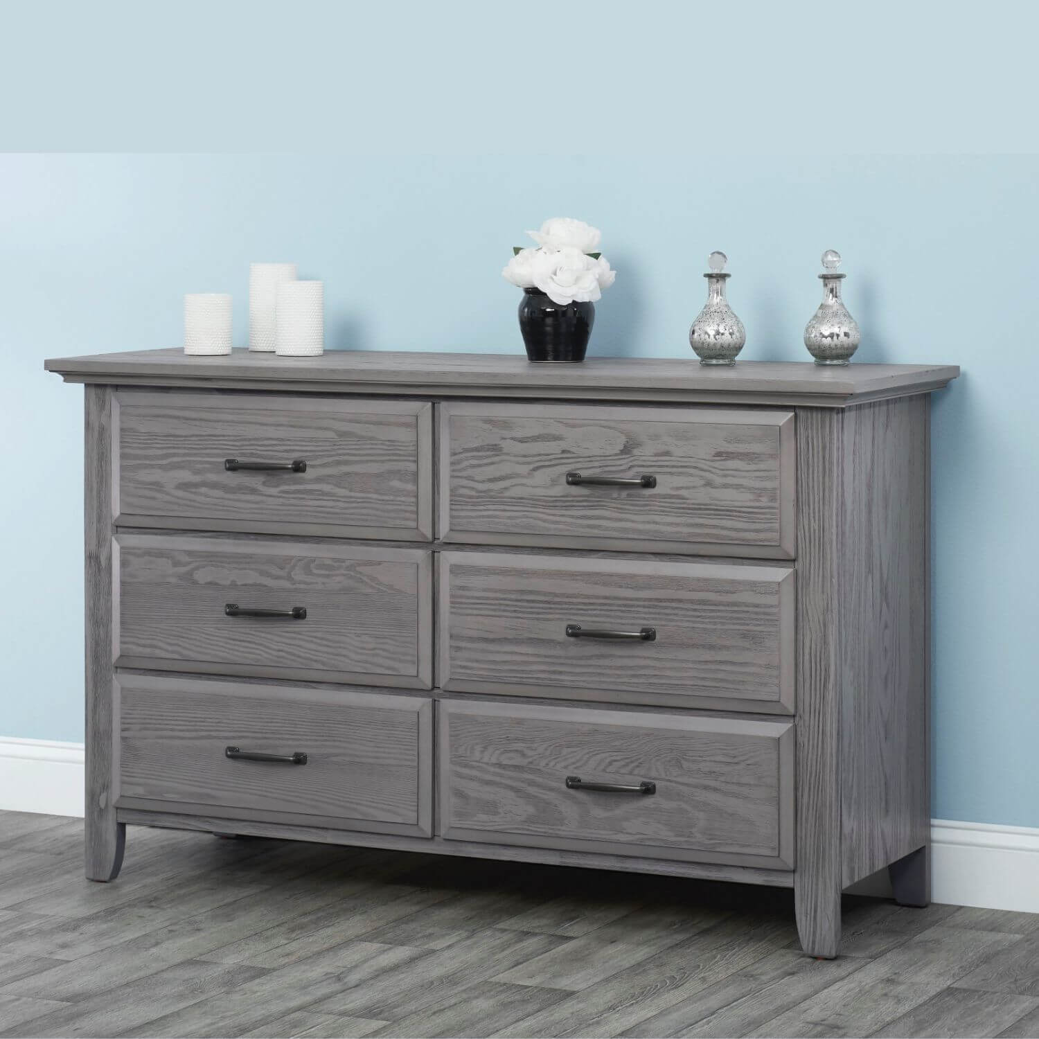 Versatile Elegance: Soho Baby Chandler 6 Drawer Dresser in Graphite Gray. Elevate your nursery with the Soho Baby Chandler 6 Drawer Dresser, meticulously designed for both style and functionality. Featuring premium side-mount ball bearing drawer glides and a safety stop mechanism, this dresser ensures smooth and secure storage. Crafted from fine solid woods and veneers with a multi-step wire brushed finish in Graphite Gray, the 6 dresser drawers showcase sturdy and durable French Dovetail construction, stylish drawer pulls, and top drawers adorned with luxurious velvet lining. Transform your nursery into a haven of versatility and sophistication with the Soho Baby Chandler 6 Drawer Dresser in Graphite Gray – where style meets practicality for your baby's essentials.