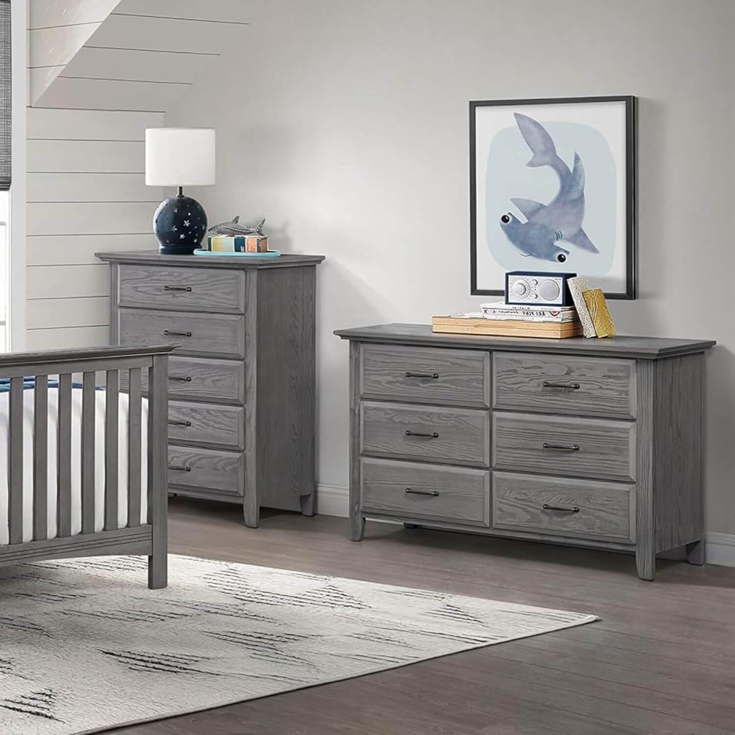 - COMPLETE NURSERY COLLECTION: The Chandler Collection by Soho Baby in Graphite Gray features a 4-in-1 Convertible Crib (44011530), 2-Drawer Nightstand (44022530), 5-Drawer Dresser (44035530), 6-Drawer Dresser (44036530), Changing Topper (44065530), Toddler Bed Guard Rail (44095530), Full-Size Bed Conversion Kit (44088530), and Soho Baby Crib Mattress, sold separately; The Chandler Collection is available in Graphite Gray and Stone Wash finishes.