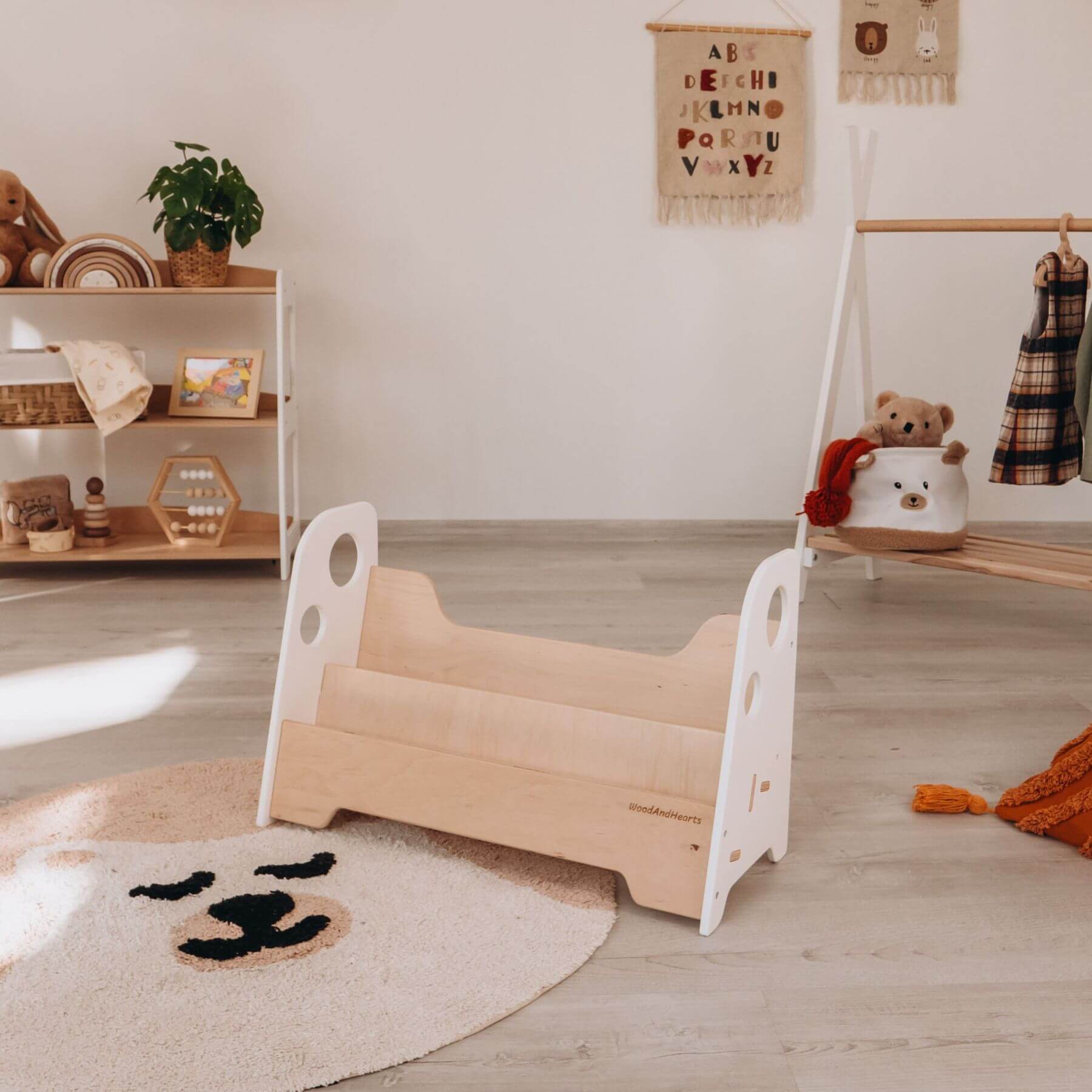 Encourage independent reading and organization with the Wood and Hearts Kids Bookshelf "Adam"! Designed with Montessori principles, this beautifully crafted front-facing bookcase makes it easy for little ones to see, choose, and return their books independently. Perfect for ages 1 to 6, this stylish and functional bookshelf turns any room into a cozy reading corner while fostering a lifelong love for books. To your attention: wooden shelf needs a little assembly!