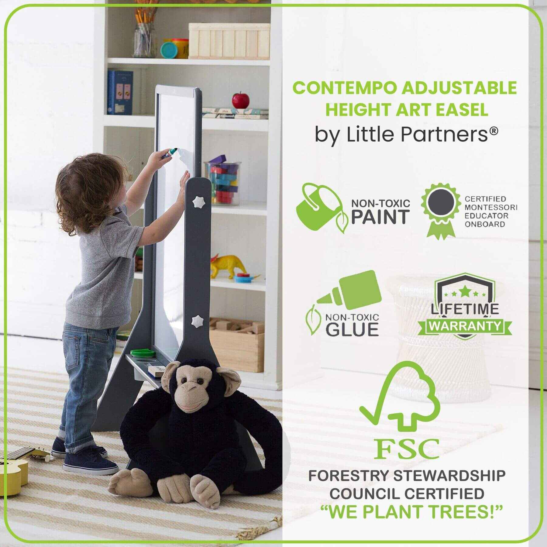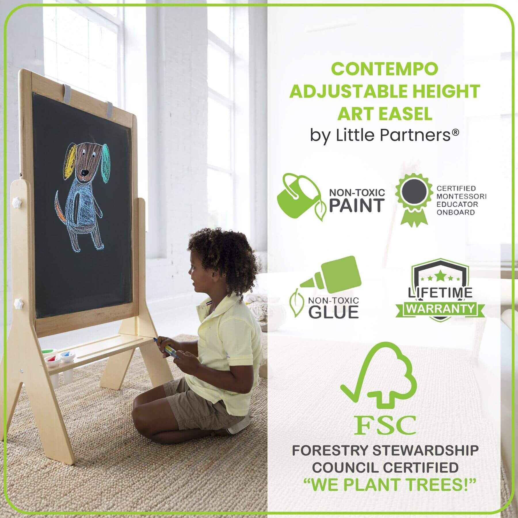 Unleash your child’s imagination with the Little Partners Contempo Art Easel—a beautifully crafted two-sided easel designed for budding artists. With a magnetic whiteboard on one side and a chalkboard on the other, this easel offers endless ways to draw, paint, and play. Built-in storage and an adjustable height design make it easy to use, easy to clean, and easy to love—for both kids and parents.