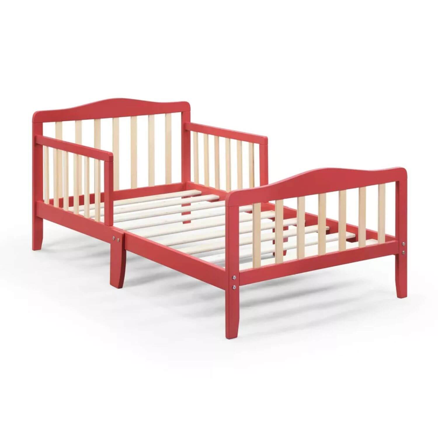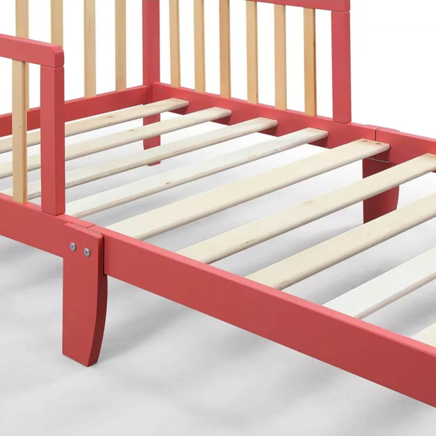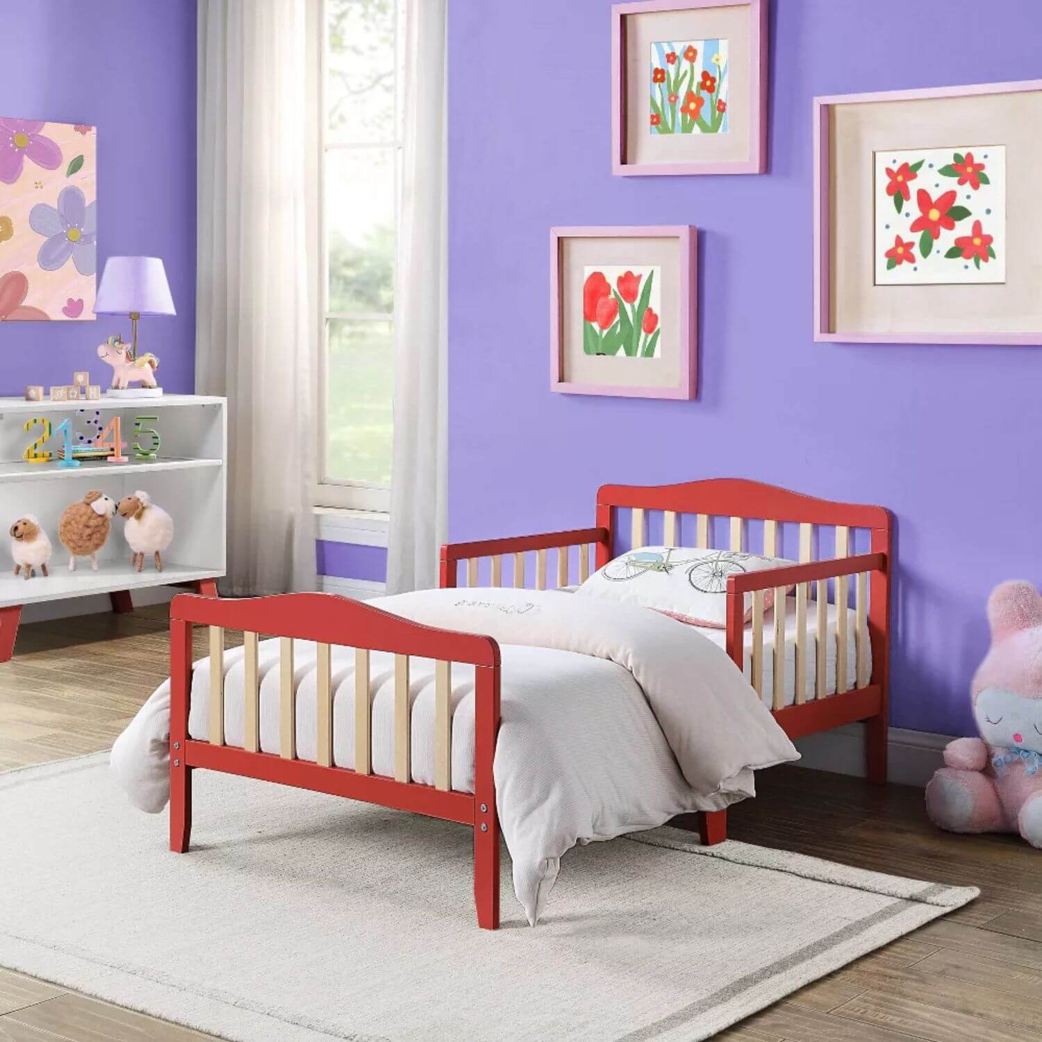 The Twain Toddler Bed Coral/Natural blends contemporary style with safety, creating a fun and functional space for your little one. Its two-tone finish and low-profile design make it easy for toddlers to climb in and out, fostering independence. Crafted from solid wood with dual safety side rails, the Twain Toddler Bed offers a secure transition from crib to “big kid” bed.